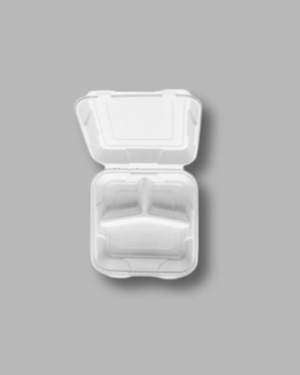Large, sturdy clamshell with three compartments. Made from 100% biodegradable bagasse,